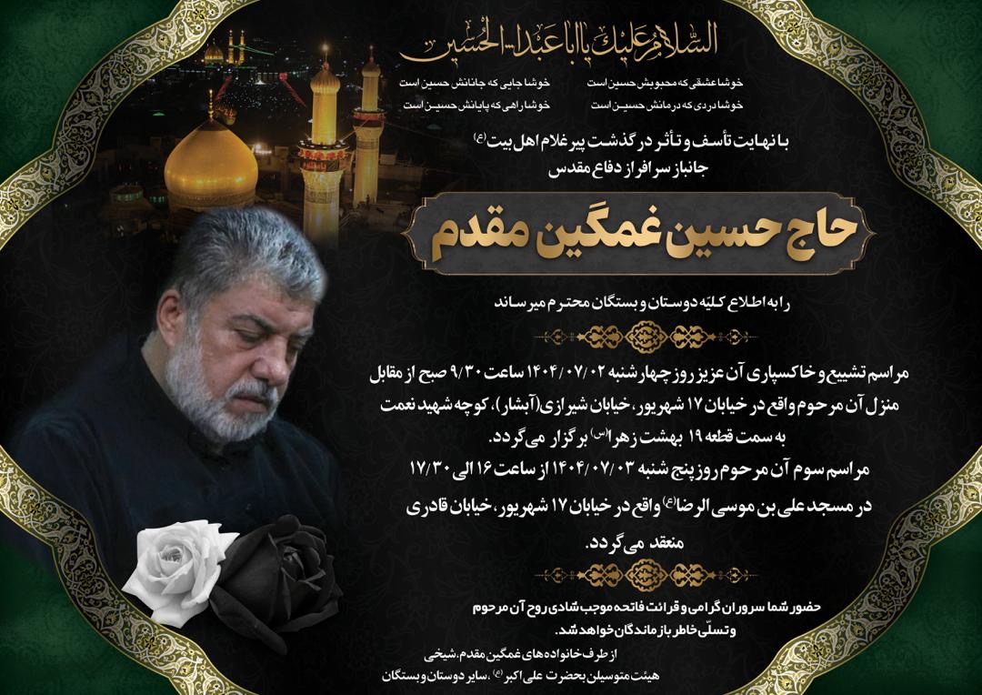 .پیرغلام آستان حضرت سیدالشهداء حاج حسین غمگین مقدم به سوی همرزمان شهیدش شتافت